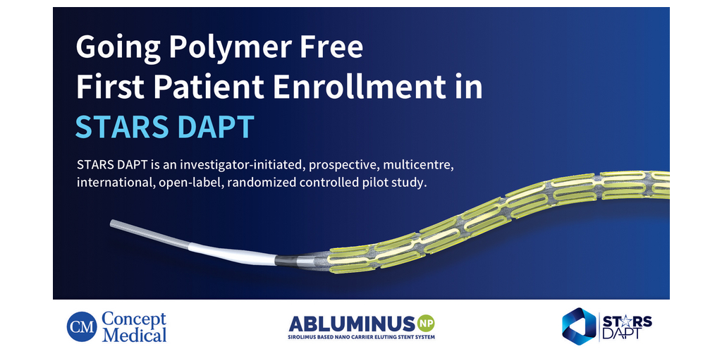 TAMPA, Fla.--(BUSINESS WIRE)--#ConceptMedical--Concept Medical Inc., a global pioneer in innovative drug delivery technology, is proud to announce the successful enrollment of the first patients in the STARS DAPT (ST-Segment Elevation Myocardial InfArction treated with a Polymer-Free Sirolimus-based NanocarrieR Eluting Stent and a P2Y12 inhibitor-based Single Antiplatelet Strategy after a Short Dual Antiplatelet Therapy versus conventional Dual AntiPlatelet Therapy) randomized controlled trial. This trial marks a significant milestone in evaluating the breakthrough technology of polymer free drug eluting stent (DES) for the treatment of STEMI patients.