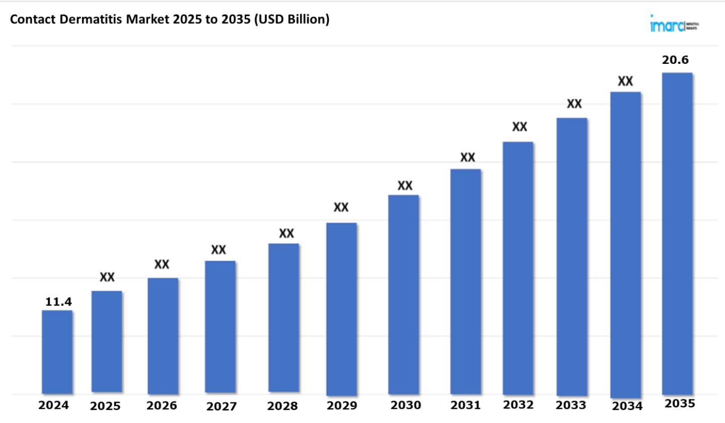 The 7 major contact dermatitis market reached a value of USD 11.4 Billion in 2024. Looking forward, IMARC Group expects the 7MM to reach USD 20.6 Billion by 2035, exhibiting a growth rate (CAGR) of 5.54% during 2025-2035. The contact dermatitis market is seeing notable growth as more people experience skin reactions due to allergies and irritants. Increased awareness of skin health and improvements in treatments are driving this trend. There is a growing demand for effective topical solutions like moisturizers, which are helping to fuel the market. Consumers are also turning to over-the-counter products designed for sensitive skin, further boosting the market's expansion. Companies are investing in new product development to offer better options, while greater access to healthcare and regulatory support are strengthening this growth.