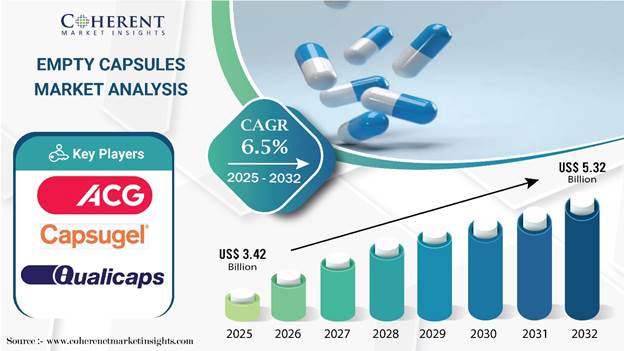 Global Empty Capsules Market is estimated to be valued at USD 3.42 Bn in 2025 and is expected to reach USD 5.32 Bn exhibiting a compound annual growth rate (CAGR) of 6.5% from 2025 to 2032. The Empty Capsules Market is projected to experience robust growth throughout the forecast period, driven by increasing demand across the pharmaceutical, nutraceutical, and dietary supplement industries. Capsules continue to gain popularity owing to their ease of consumption, precise dosage control, and ability to mask unpleasant tastes, making them an ideal and effective delivery medium for a wide range of active ingredients.