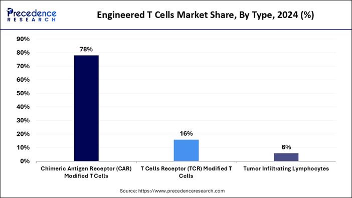 ➢ By type, the chimeric antigen receptor (CAR) modified T cells segment accounted for the highest market share of 78% in 2024.