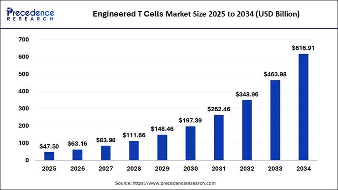 According to Precedence Research, the global engineered T cells market size is expected to be worth over USD 616.91 billion by 2034, increasing from USD 47.5 billion in 2025, growing at a strong CAGR of 32.96% between 2025 and 2034.