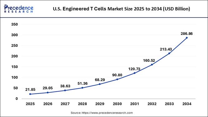 According to Precedence Research, the U.S. engineered T cells market size is estimated at USD 21.86 billion in 2025 and is projected to exceed USD 286.86 billion by 2034. The industry is accelerating a double-digit compound annual growth rate (CAGR) of 29.37% from 2025 to 2034.