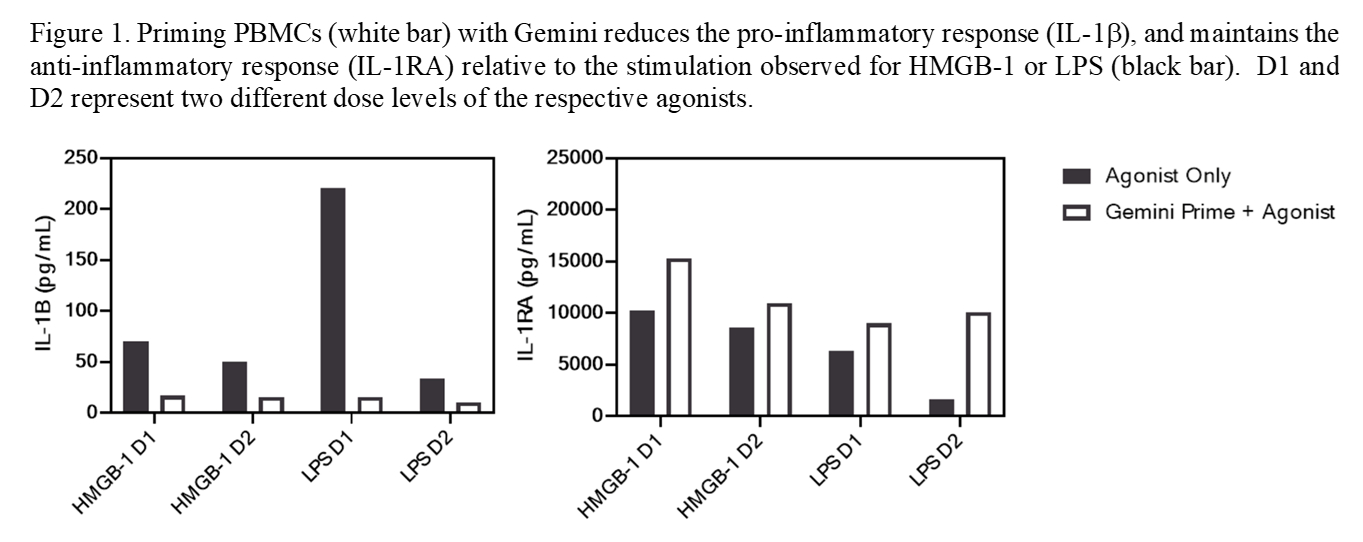 In this study, human PBMCs were primed with either Gemini or placebo followed by challenge with clinically relevant promoter molecules of inflammation including high mobility box protein-1 (HMGB-1) and lipopolysaccharide (LPS) in vitro. HMGB-1 is an endogenous damage associated molecular pattern (DAMP) that is generated during tissue injury (e.g. during surgery) which drives the inflammatory response. LPS is an exogenous pathogen associated molecular pattern (PAMP) that is generated from a bacterial infection and drives the inflammatory response associated with infection (e.g. fever).