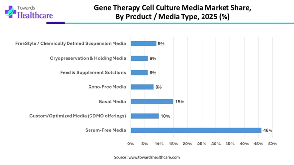 ➔By application/process stage, the upstream viral vector production segment led the gene therapy cell culture media market with the largest revenue share of approximately 44% in 2025.