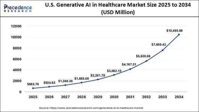 According to Precedence Research, the global generative AI in healthcare market size is estimated at USD 2.64 billion in 2025 and is projected to reach USD 39.70 billion by 2034, growing at a double-digit CAGR of 35.17% from 2025 to 2034.