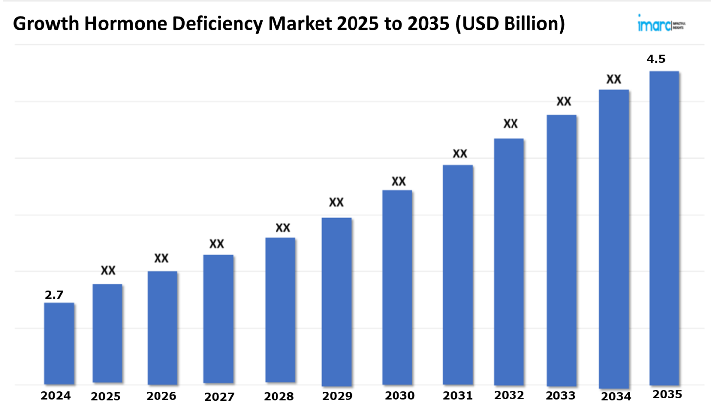 The 7 major growth hormone deficiency market reached a value of USD 2.7 Billion in 2024. Looking forward, IMARC Group expects the 7MM to reach USD 4.5 Billion by 2035, exhibiting a growth rate (CAGR) of 4.67% during 2025-2035. The main driver is emerging popularity of advanced formulations delivered via the subcutaneous route, based on its key advantages including long-lasting action within the body and allowing once a week injections instead of daily dosing. Advanced delivery systems improve bioavailability while maintaining steady levels of growth hormone, thereby ensuring patient compliance. Even injection discomfort is reduced by needle-free and auto-injector technologies, further supporting adherence. The market is expanding as more and more patients adopt subcutaneous long-acting growth hormone therapies, thereby offering better quality of life to patients through the most effective, patient-friendly treatment options.