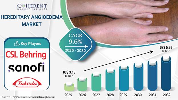 According to Coherent Market Insights, Hereditary Angioedema Market size is estimated to be valued at USD 3.13 Bn in 2025 and is expected to reach USD 5.96 Bn by 2032, exhibiting a compound annual growth rate (CAGR) of 9.6% from 2025 to 2032. The growth of the Hereditary Angioedema Market is primarily driven by the rising awareness of the disorder and the introduction of advanced treatment options. The development of improved diagnostic tools has enabled earlier and more accurate detection of the condition, leading to an expanding patient base and a growing demand for effective therapies.