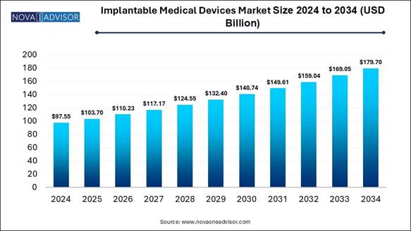 According to Nova One Advisor, the global implantable medical devices market size is calculated at USD 97.55 billion in 2024, grows to USD 103.70 billion in 2025, and is projected to reach around USD 179.70 billion by 2034, growing at a CAGR of 6.3% from 2025 to 2034.