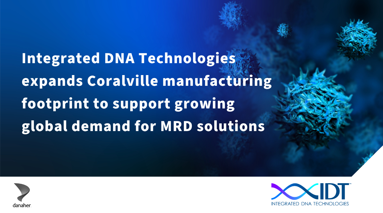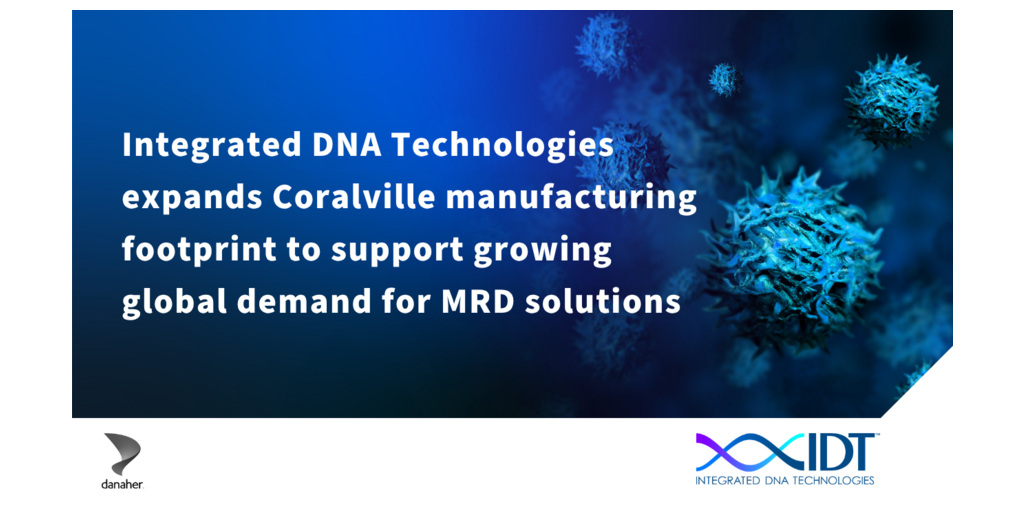 CORALVILLE, Iowa--(BUSINESS WIRE)--#Biomarker--Integrated DNA Technologies (IDT), a Danaher company and a global leader in genomics, today announced the expansion of its manufacturing footprint in Coralville, Iowa. The investment delivers a more than threefold increase in synthesis capacity, enabling faster, more scalable production of high‑quality, customizable oligonucleotides that support next‑generation sequencing (NGS)‑based oncology workflows, including minimal residual disease (MRD) applications.
