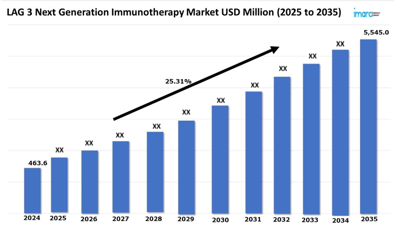 The Lag-3 Next Generation Immunotherapy market reached a value of USD 463.6 Million in 2024. Looking forward, IMARC Group expects the 7MM to reach USD 5,545.0 Million by 2035, exhibiting a growth rate (CAGR) of 25.31% during 2025-2035. The treatment landscape for LAG-3, or Lymphocyte-Activation Gene 3, next-generation immunotherapy is undergoing a radical shift from the traditional immune checkpoint inhibitors to more advanced and targeted treatments that support anti-tumor immunity. The driving force behind this paradigm shift is largely our increasing understanding of T-cell exhaustion mechanisms and our recognition of LAG-3's critical role in immune regulation. As a result, there have been remarkable discoveries of new checkpoint inhibitors, besides the unprecedented advances in combination immunotherapies. In the course of this revolution, there is now FDA approval for Nivolumab/relatlimab (Opdualag) which was announced as the first LAG-3 inhibitor that is being launched. Results of clinical studies also show that in combination with PD-1 blockade, relatlimab provides significantly enhanced antitumor efficacy and has shown a potential for great improvement of patients' conditions when treated with the disease. Also, the landscape of treatment continues to grow with the incorporation of bispecific antibodies, dual checkpoint blockade strategies, and individualized biomarker-driven therapies. These new approaches synergistically combine LAG-3 inhibition with established PD-1/PD-L1 therapies to aim for the best immune activation strategy that will potentially help in surmounting resistance issues many patients encounter.