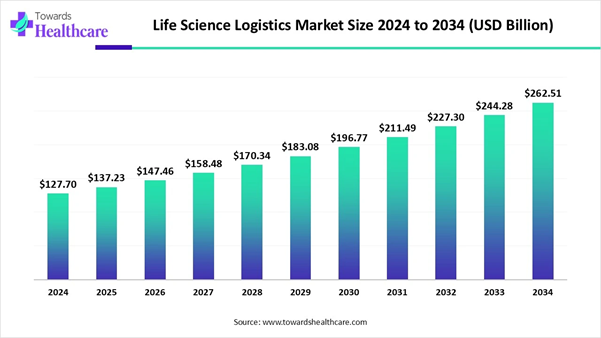 According to Towards Healthcare research, the global life science logistics market was valued at USD 127.7 billion in 2024 and is expected to grow from USD 137.23 billion in 2025 to approximately USD 262.51 billion by 2034, registering a CAGR of 7.46% during the forecast period from 2025 to 2034.
