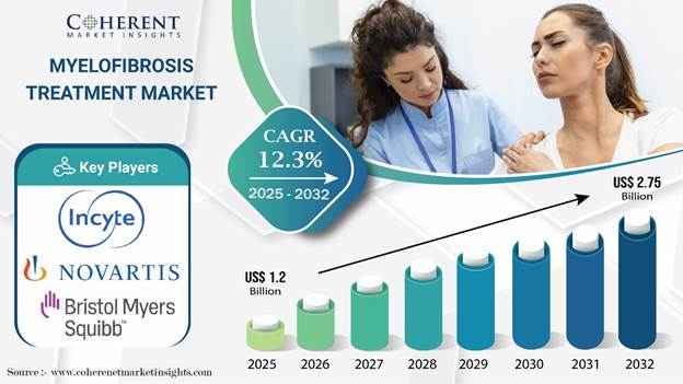 According to Coherent Market Insights (CMI), the global myelofibrosis treatment market size is projected to expand at a CAGR of 12.3% during the forecast period, reaching USD 2.75 Bn by 2032, up from USD 1.2 Bn in 2025.