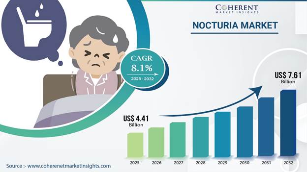 The Global Nocturia Market is estimated to be valued at USD 4.41 Bn in 2025 and is expected to reach USD 7.61 Bn by 2032, exhibiting a compound annual growth rate (CAGR) of 8.1% from 2025 to 2032. This growth is driven by the rising prevalence of nocturia across multiple age groups, supported by increased awareness, advancements in diagnostic technologies, and expanding treatment options. Market expansion is further reinforced by the growing geriatric population and the increasing incidence of related underlying conditions, including diabetes and cardiovascular diseases
