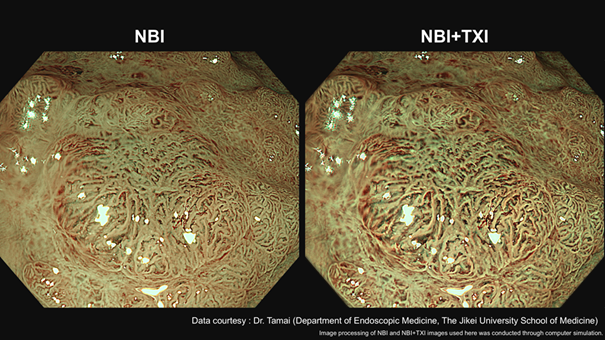NBI mode, first introduced globally in 2006, brought a revolutionary change to endoscopic imaging by improving visibility of features that were previously difficult to detect, making the invisible visible. The CV-1500 incorporates the latest NBI mode, achieving improved brightness compared to the original NBI mode. TXI mode, introduced with the CV-1500, further improves the visibility of lesions through its image enhancement technology when used with conventional light observation. The combination of these two technologies in the CV-1500, the NBI+TXI observation mode is expected to further enhance and optimize the contrast information in NBI mode images, supporting more precise endoscopic examinations and treatments.