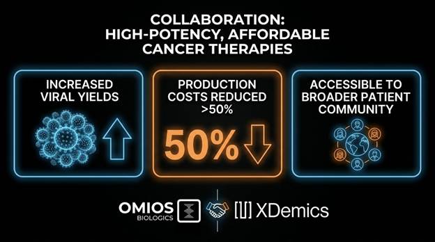 Omios Biologics and XDemics Corporation have launched a strategic collaboration to revolutionize oncolytic virus manufacturing by combining biomarker-guided selectivity with high-density bioproduction. This partnership aims to deliver high-potency, affordable cancer therapies by drastically increasing viral yields and reducing production costs by at least 50 percent.