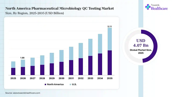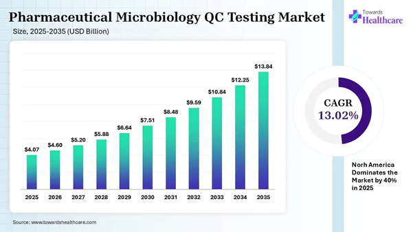 The global pharmaceutical microbiology QC testing market size was estimated at USD 4.07 billion in 2025 and is predicted to increase from USD 4.6 billion in 2026 to approximately USD 13.84 billion by 2035, expanding at a CAGR of 13.02% from 2026 to 2035.