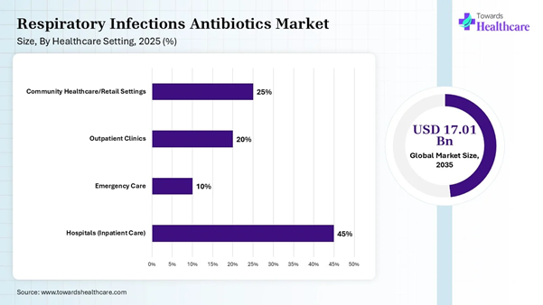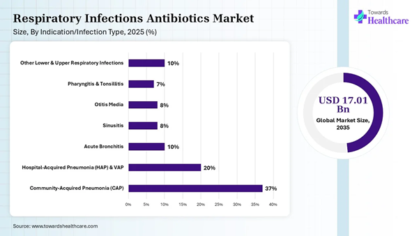 • By indication/infection type, the community-acquired pneumonia (CAP) segment held an approximate 37% share in the market in 2025.
