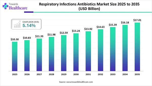The global respiratory infection antibiotics market was valued at USD 10.3 billion in 2025, forecast to grow from USD 10.83 billion in 2026, reaching an estimated USD 17.01 billion by 2035, reflecting a compound annual growth rate (CAGR) of 5.14% from 2026 to 2035.