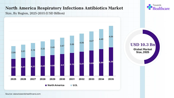 The respiratory infections antibiotics market in the U.S. to reach USD 4.84 billion by 2035, witnessing strategic R&D and funding, advanced healthcare infrastructure, innovations in antimicrobial resistance, and the rising trend of combination therapies. The Centers for Disease Control and Prevention (CDC) reported on the antibiotic stewardship efforts in the U.S., which showcase the prescribing and use of antibiotics only after ensuring their health benefits. The CDC also proclaimed that improving the use of antibiotics is a major strategy to improve patient safety and fight against antimicrobial resistance in the U.S.