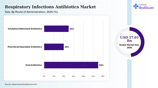The oral antibiotics segment dominated the market share by 55% in 2025, owing to their integral functions in treating bacterial infections, preventing infections, and enabling early hospital discharge. They reduce complications, bring cost effectiveness, and ensure patient convenience. Oral therapy is the preferred choice over intravenous treatment for many infections due to its lower costs, efficacy, and reduced risk of complications.
