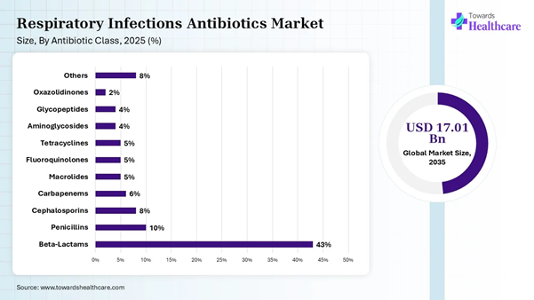 Segments Covered in the Report: (By Antibiotic Class: Beta-Lactams, Penicillins, Cephalosporins, Carbapenems, Macrolides, Fluoroquinolones, Tetracyclines, Aminoglycosides, Glycopeptides, Oxazolidinones, Others; By Route of Administration: Oral Antibiotics, Parenteral/Injectable Antibiotics, Inhalation/Nebulized Antibiotics; By Indication/Infection Type: Community-Acquired Pneumonia (CAP), Hospital-Acquired Pneumonia (HAP) & Ventilator-Associated Pneumonia (VAP), Acute Bronchitis, Sinusitis, Otitis Media, Pharyngitis & Tonsillitis, Other Lower & Upper Respiratory Infections, By Healthcare Setting: Hospitals (Inpatient Care), Emergency Care, Outpatient Clinics, Community Healthcare/Retail Settings; By Region: North America, South America, Europe, Asia Pacific, MEA) Global Analysis, Size, Trends, Leading Companies, Regional Outlook and Forecast 2026 to 2035.