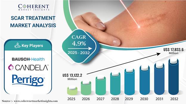 According to Coherent Market Insights, Scar Treatment Market size is estimated to be valued at USD 13,122.2 Mn in 2025 and is expected to reach USD 17,833.6 Mn in 2032, exhibiting a compound annual growth rate (CAGR) of 4.48% from 2025 to 2032. The global scar treatment market is witnessing significant growth, fueled by the increasing incidence of surgical procedures, burns, and trauma cases worldwide. Topical scar products, such as gels and creams, hold a major market share owing to their convenience and widespread regulatory approvals. North America currently leads the market, while the Asia Pacific region is emerging as a high-growth area with expanding healthcare access and rising consumer awareness.