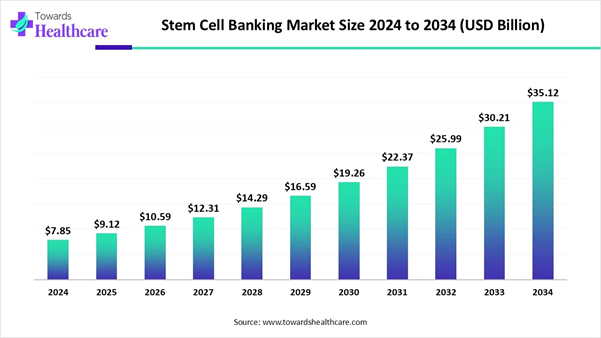 According to Towards Healthcare research, the global stem cell banking market is valued at USD 7.85 billion in 2024 and is expected to increase to USD 9.12 billion in 2025. Over the forecast period from 2025 to 2034, the market is projected to grow at a robust CAGR of 16.14%, reaching approximately USD 35.12 billion by 2034.