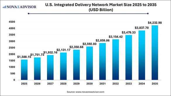 According to Nova One Advisor, the U.S. integrated delivery network market size was valued at USD 1,588.15 billion in 2025 and is poised to grow from USD 1,751.73 billion in 2026 to USD 4,232.98 billion by 2035, at a CAGR of 10.3% during the forecast period 2026-2035.