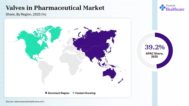 • Asia Pacific held the major revenue share of 39.2% in the global valves in pharmaceutical market in 2025.