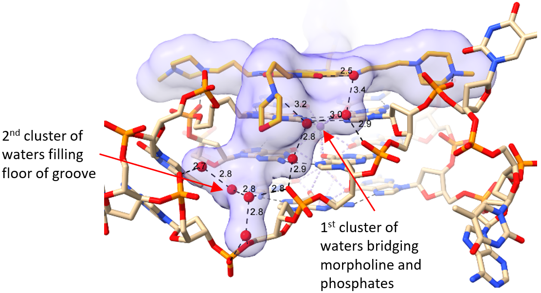 Poster 2926, “Structure-based design of quadruplex-binding small molecule compounds: The essential role of water molecules” (Dr. Stephen Neidle) Crystal structures and computer modelling were utilized to characterize the details of the interactions of substituted naphthalene diimides targeted against human DNA quadruplexes, and in particular the role of water molecules in the binding site. It is concluded that information on conserved water molecules is important for drug design and has been used in the design of a current lead compound QN-302.