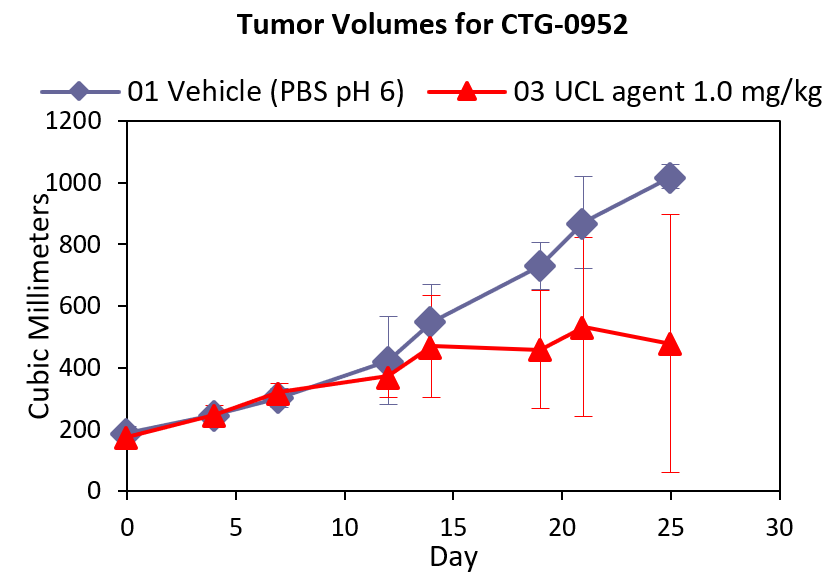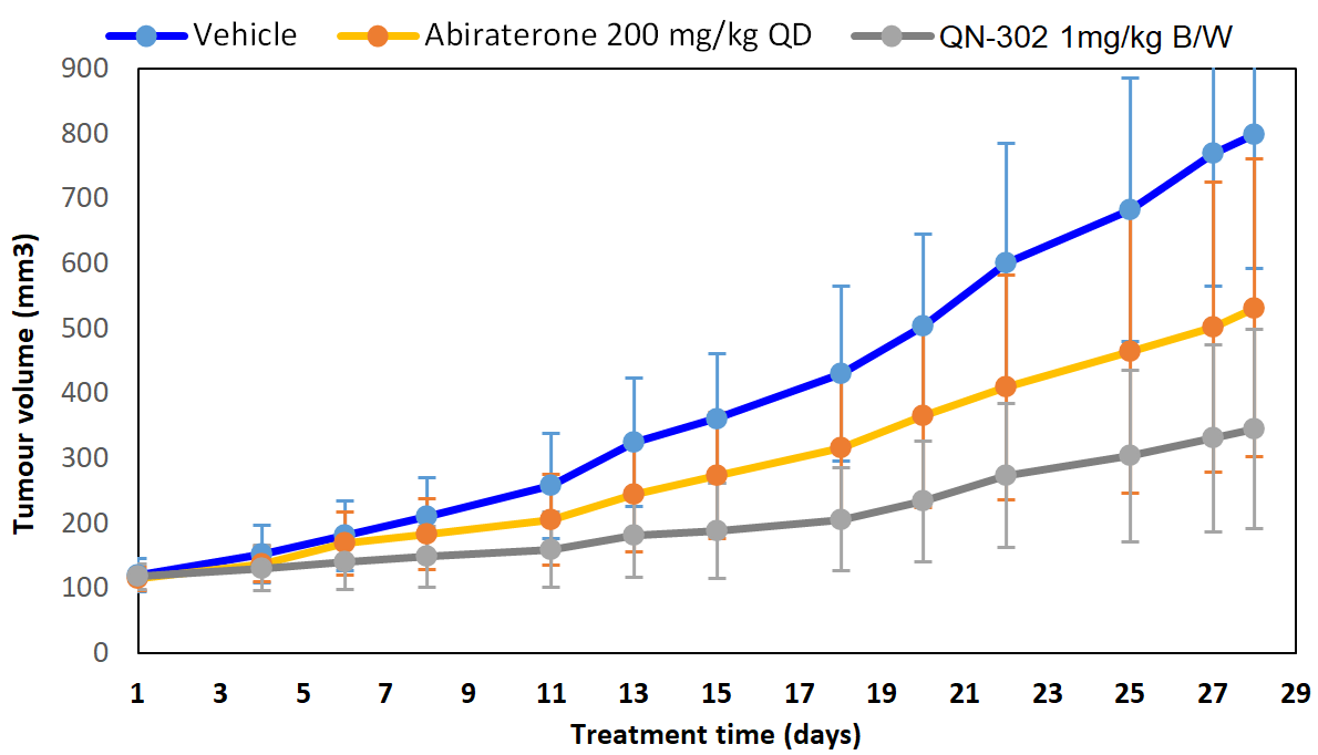Poster 4068, “The potent quadruplex-binding compound QN-302showspotent anti-proliferative activity in a prostate cancer cell panel and anti-tumor activity in an in vivo model of metastatic prostate cancer” (Dr. Stephen Neidle) demonstrated bioavailability and toleration at therapeutic doses in a prostate cancer cell line, PC3, which is derived from castration-resistant prostate cancer and is therefore relevant to the situation when hormone therapies are no longer effective. The in vivo study, which included the commonly used drug abiraterone, showed that QN-302 had statistically significant anti-tumor activity in this model (p=0.0008) relative to the controls, and was superior to abiraterone.