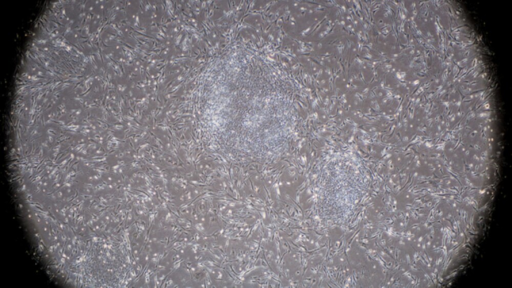 One small and one large colony of human induced Pluripotent Stem Cells (iPSCs) in culture on top of mouse feeder cells.