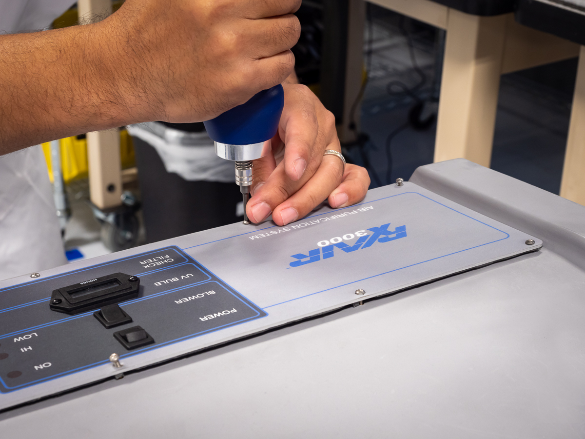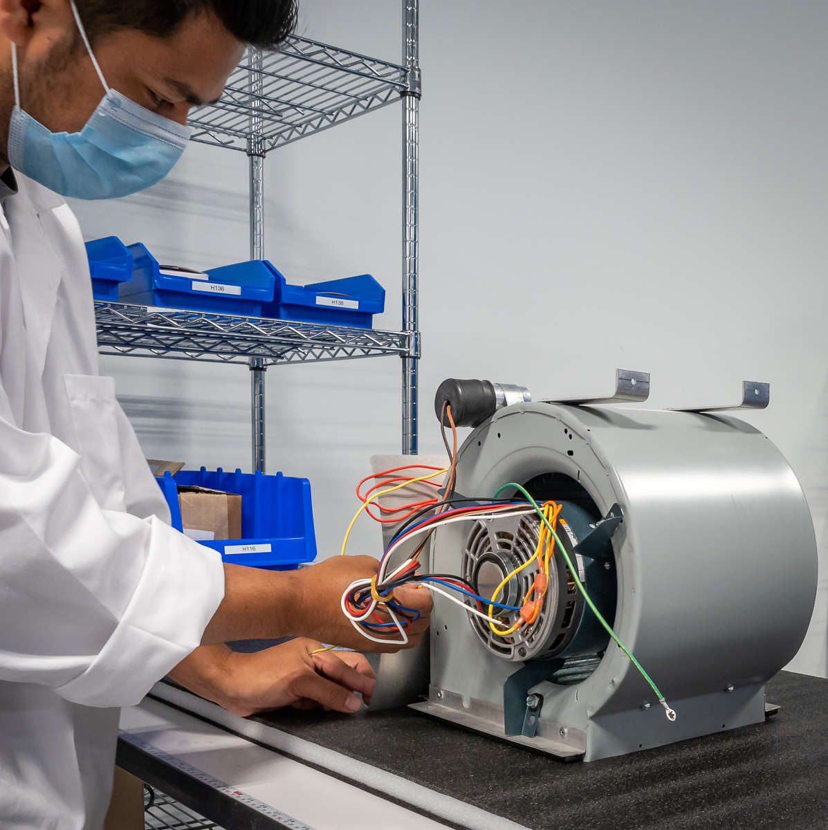 Chhor Soeung, a Scott Electronics Fixture Technician, wires a robust blower assembly for Rx3000 UV Light/HEPA air purifier powerful enough to deliver 4 to 8 air changes per hour for a 1500 to 3000 sq. ft. room.
