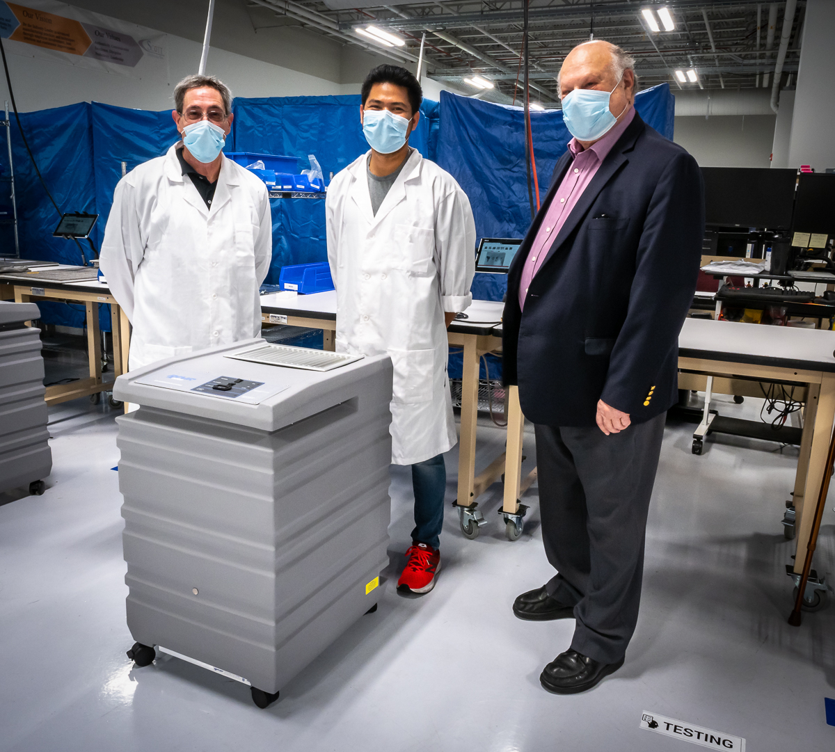 (L to R) Scott Electronics Process Engineer Frank Morey and Fixture Technician Chhor Soeung meet with Vystar CEO Steve Rotman as they prepare for full production of the new Rx3000 UV Light Air/HEPA Air Purifier.