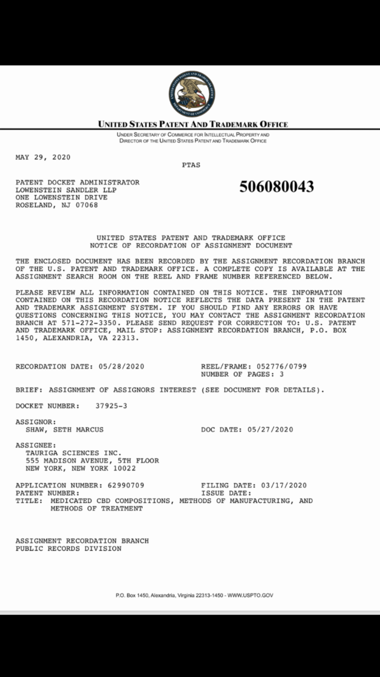 On March 18, 2020 the Company announced that it had filed a Provisional U.S. Patent covering its Pharmaceutical grade version of Tauri-Gum™. This patent application, filed with the United States Patent & Trademark Office (“U.S.P.T.O.”), is titled: “MEDICATED CBD COMPOSITIONS, METHODS OF MANUFACTURING, AND METHODS OF TREATMENT.”