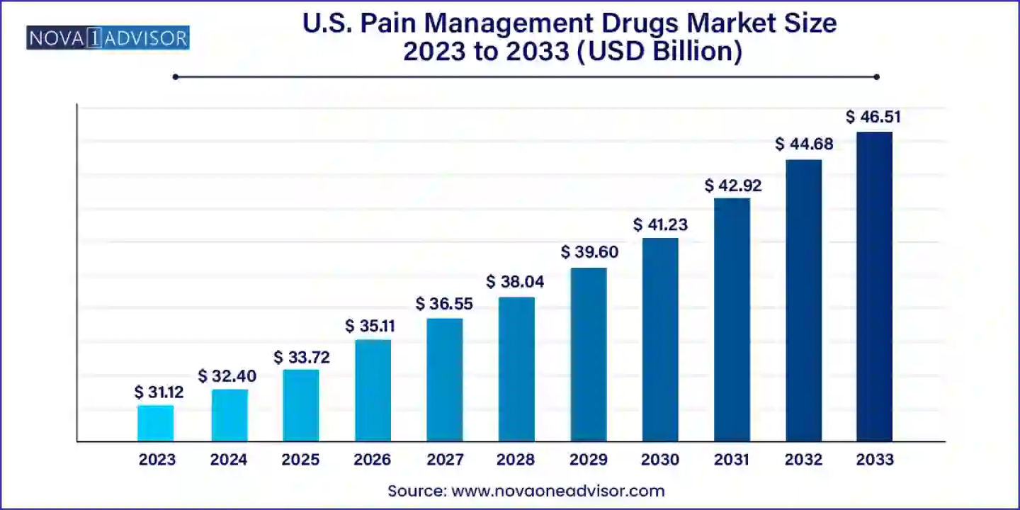 According to recent study by Nova one advisor, the U.S. pain management drugs market size was valued at USD 31.12 billion in 2023 and is anticipated to reach around USD 46.51 billion by 2033, growing at a CAGR of 4.1% from 2024 to 2033.