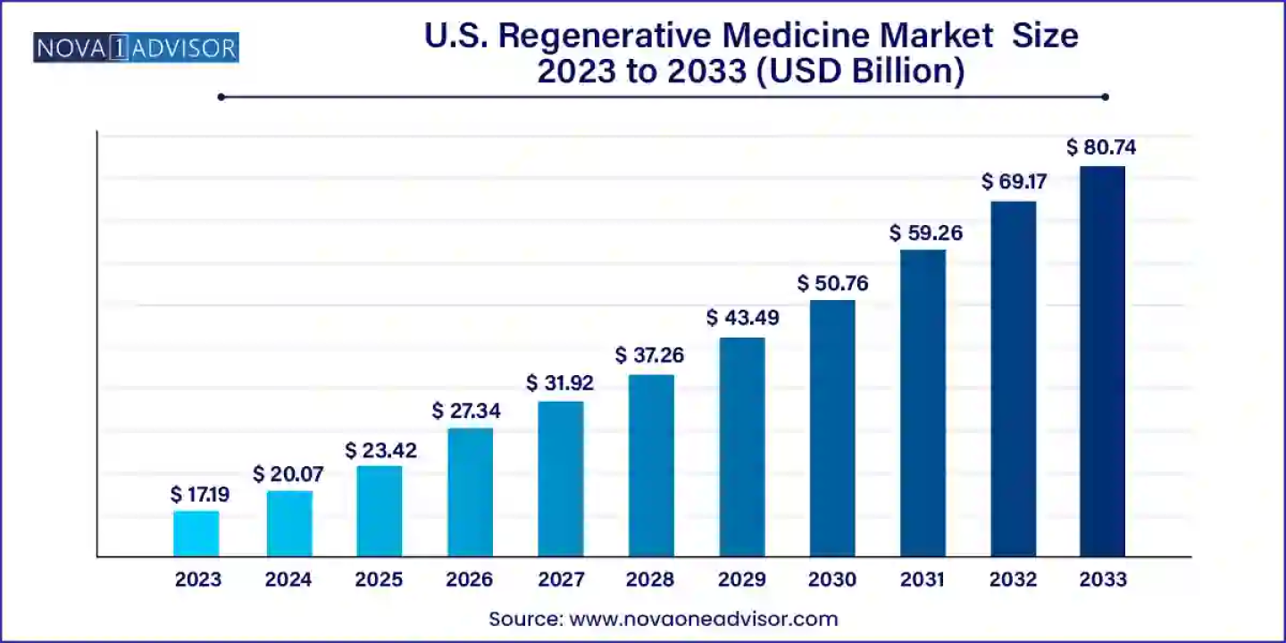 According to latest report, the U.S. regenerative medicine market size was USD 17.19 billion in 2023, calculated at USD 20.07 billion in 2024 and is expected to reach around USD 80.74 billion by 2033, expanding at a CAGR of 16.73% from 2024 to 2033. Regenerative medicine holds significant potential to revolutionize the treatment of tissues and organs damaged by age, disease, or trauma, and to correct congenital defects.