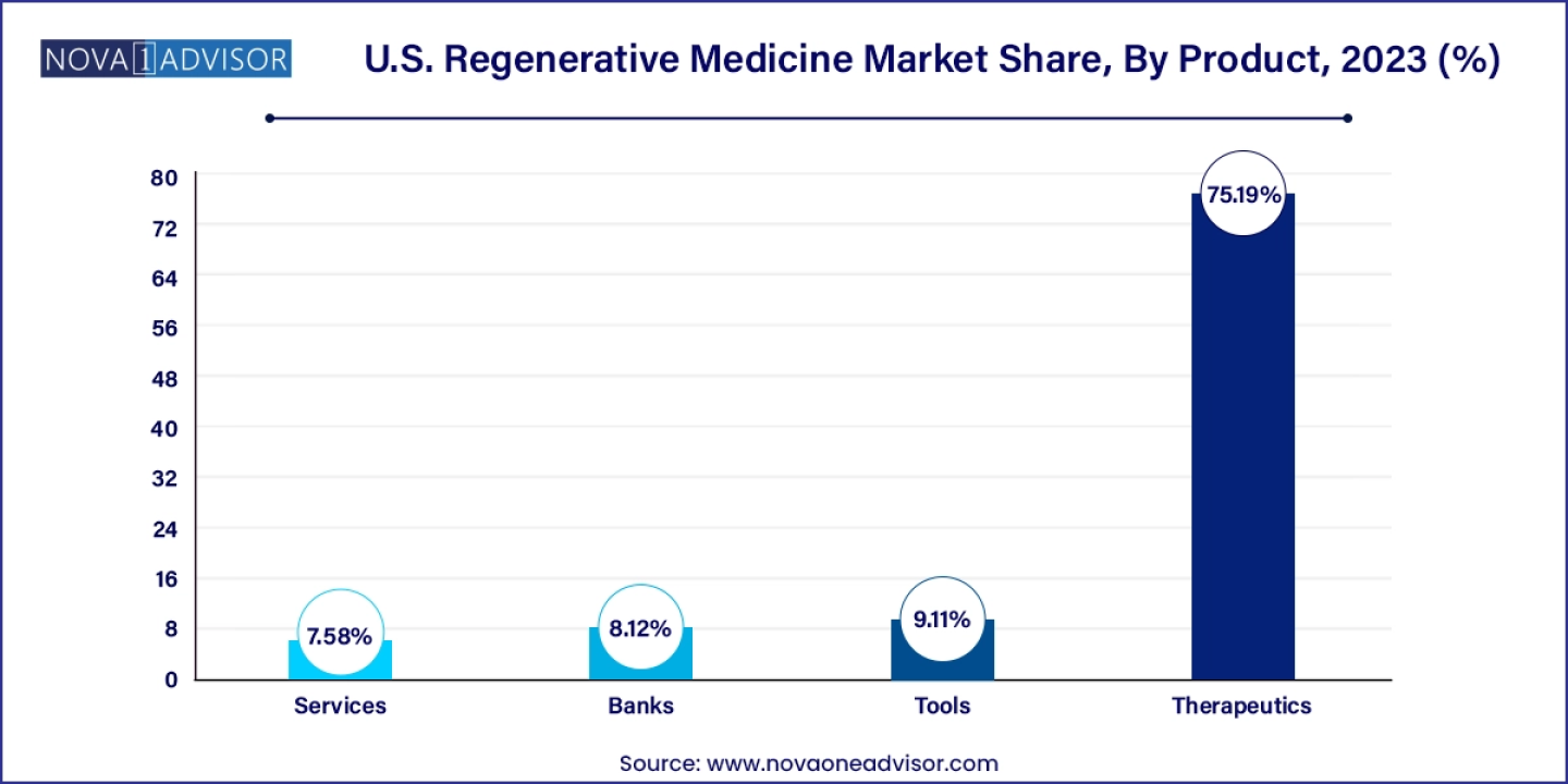 The therapeutics segment held the largest market share of 75.19% in 2023, reflecting the core objective of regenerative medicine: to replace or restore tissues and organs damaged by disease, injury, age, or congenital defects, rather than merely alleviating symptoms with medication and procedures. Regenerative medicine holds immense potential to heal or replace damaged tissues and organs, as well as normalize congenital anomalies. Robust preclinical and clinical data underscore its promise in treating both chronic diseases and acute conditions, addressing a wide range of medical issues, including dermal wounds, cardiovascular diseases, traumas, and specific cancer treatments. This transformative approach underpins the significant market share held by the therapeutics segment.