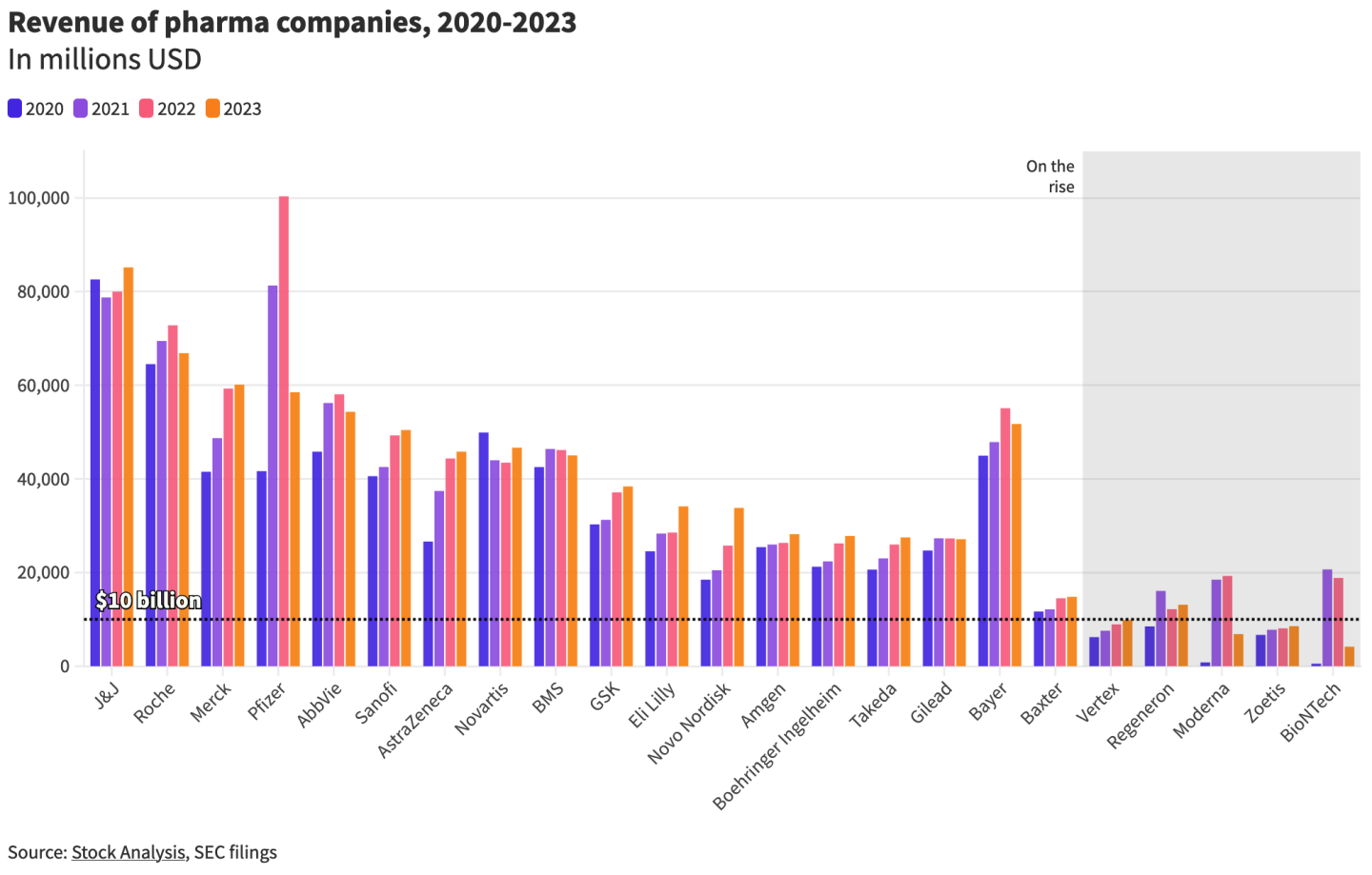 The top 20 biopharma companies by revenue all bring in well over $10 billion dollars annually. Topping the list in 2023 was Johnson & Johnson, with a grand total just north of $85 billion in sales. Last week, AstraZeneca—which ranked in the top 10 last year with nearly $46 billion in revenue—announced that it is targeting the $80 billion mark by 2030.